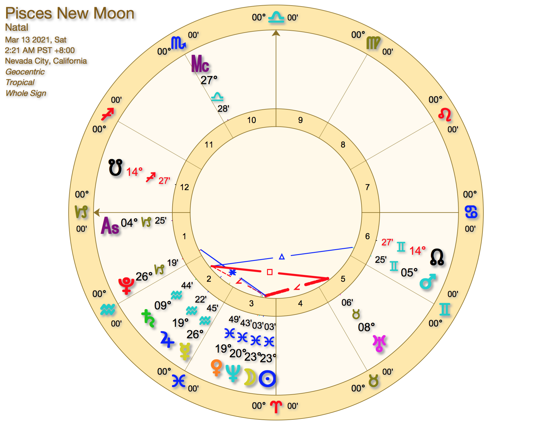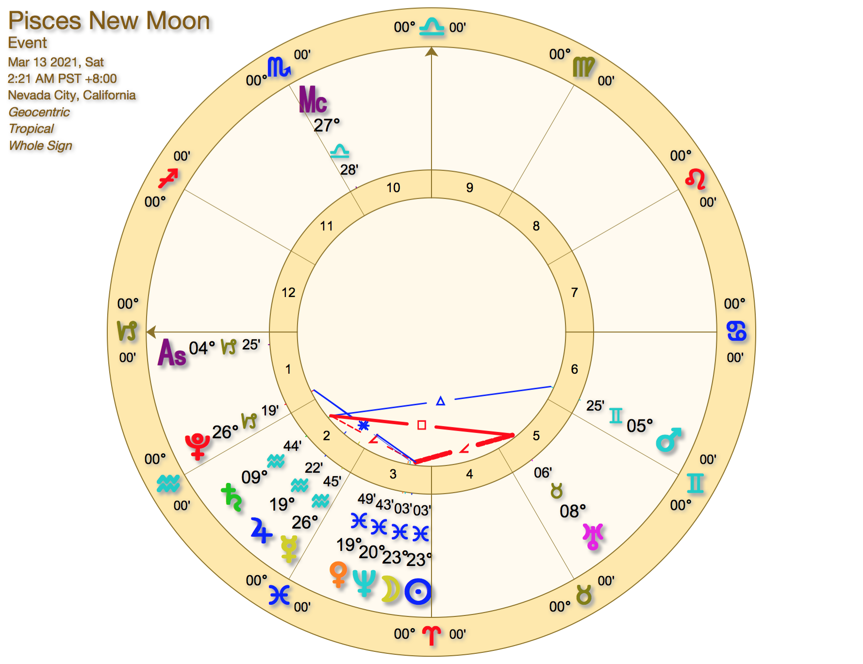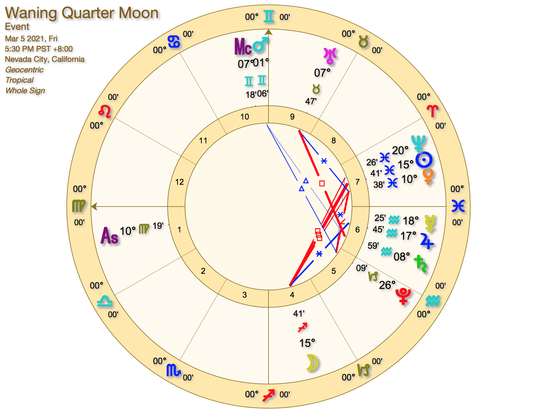During this lunation cycle the inner planets Mercury, Venus, and Mars form an intertwining dance with the outer planets in quick succession. Neptune is in a soft sextile to the Jupiter-Saturn-Pluto conjunction, and Mercury and Venus form major aspects to the entire set of planets, with Mercury trining the stellium and Venus opposing it, and Mercury opposing Neptune while Venus trines it. Together they form an exquisite and rare mystic rectangle, a complex aspect pattern made up of two oppositions, two trines, and two sextiles. Mars joins the dance, continuing to square Jupiter-Saturn-Pluto, and finally squares his lover Venus on the same day Mercury sextiles her. One can perceive an image of archetypal forces weaving a sophisticated pattern around our Earth, drawing us all into the dance in one form or another.