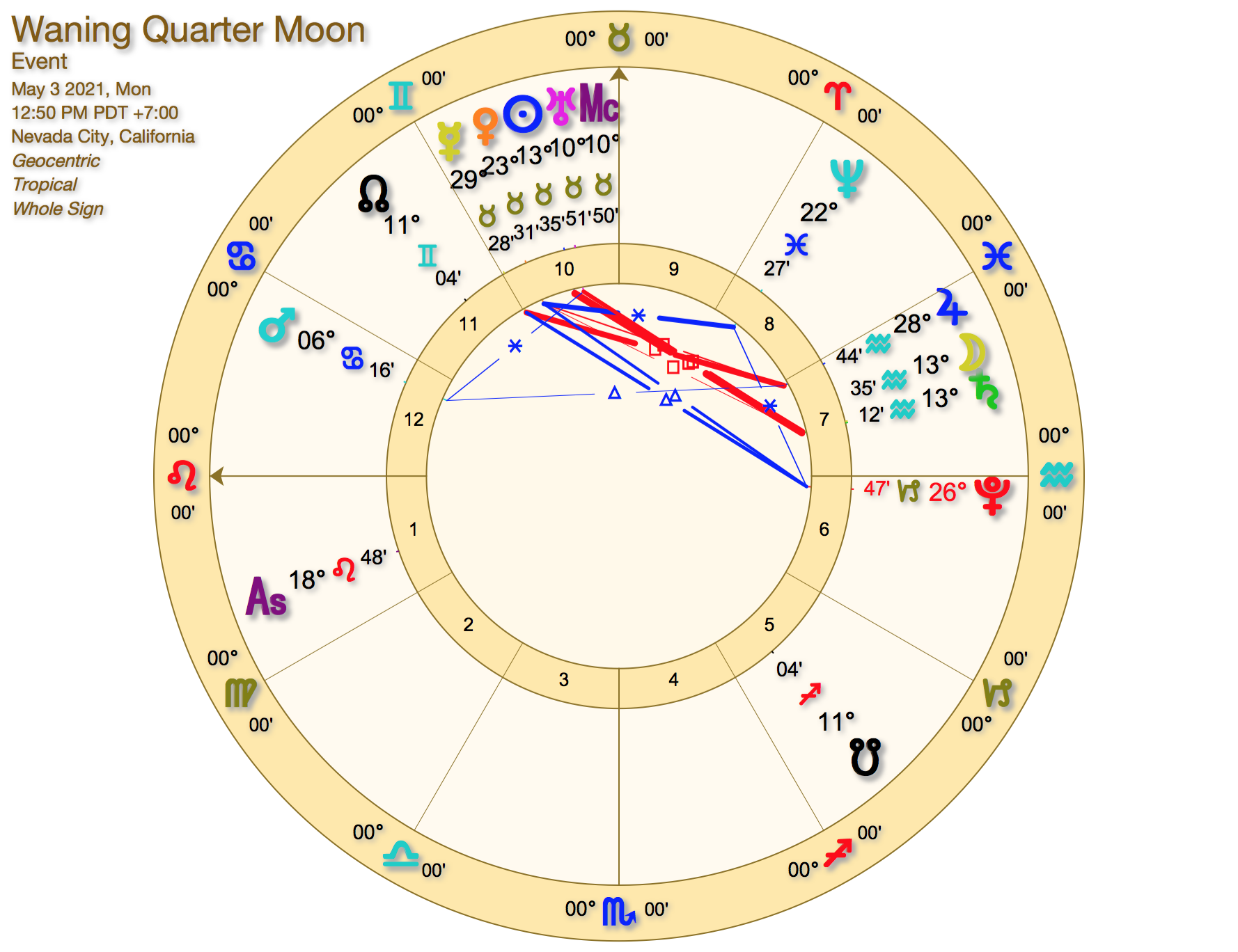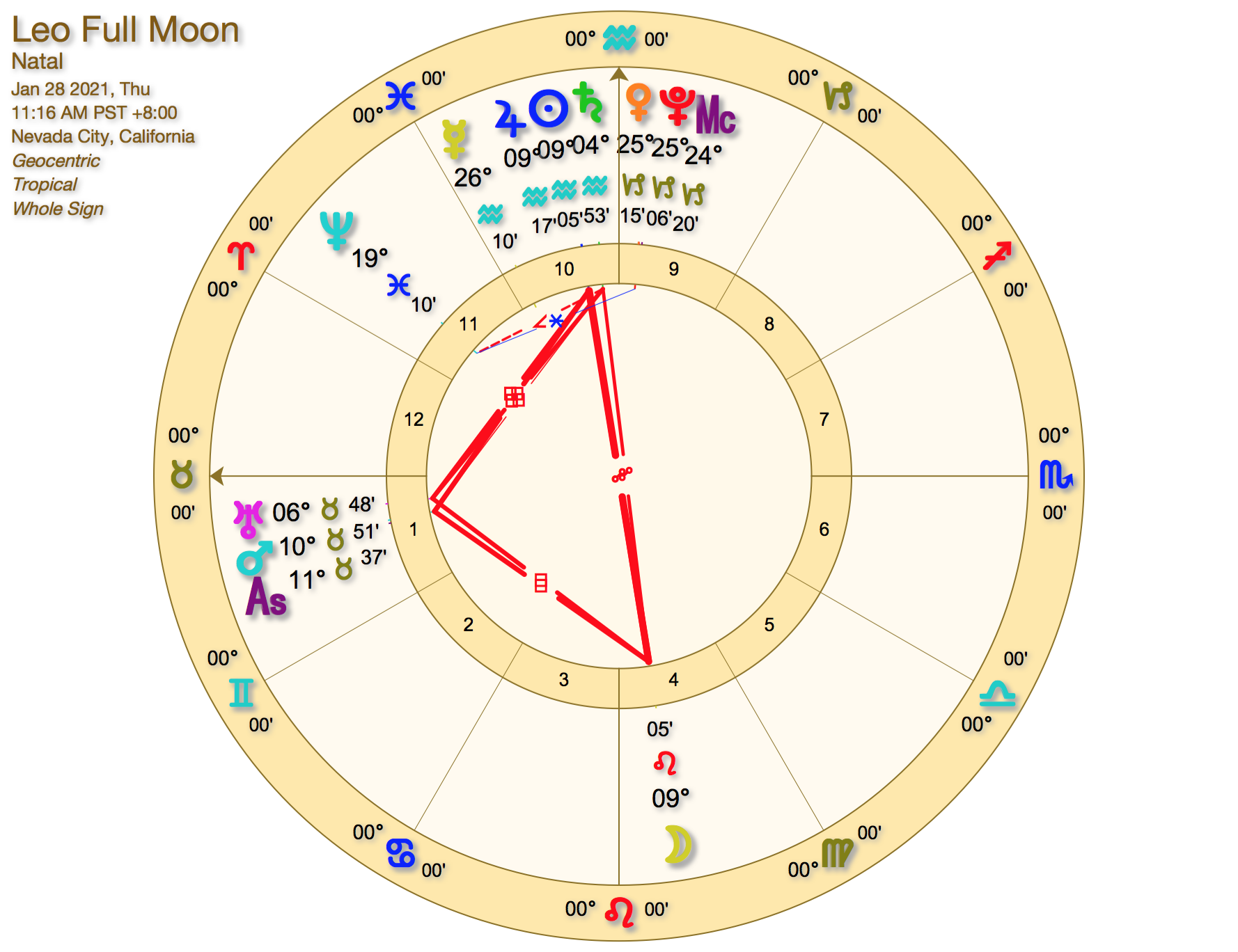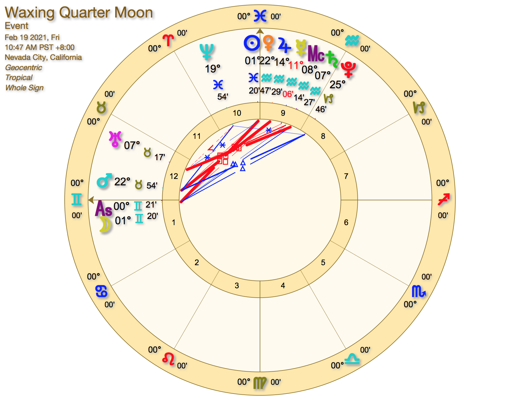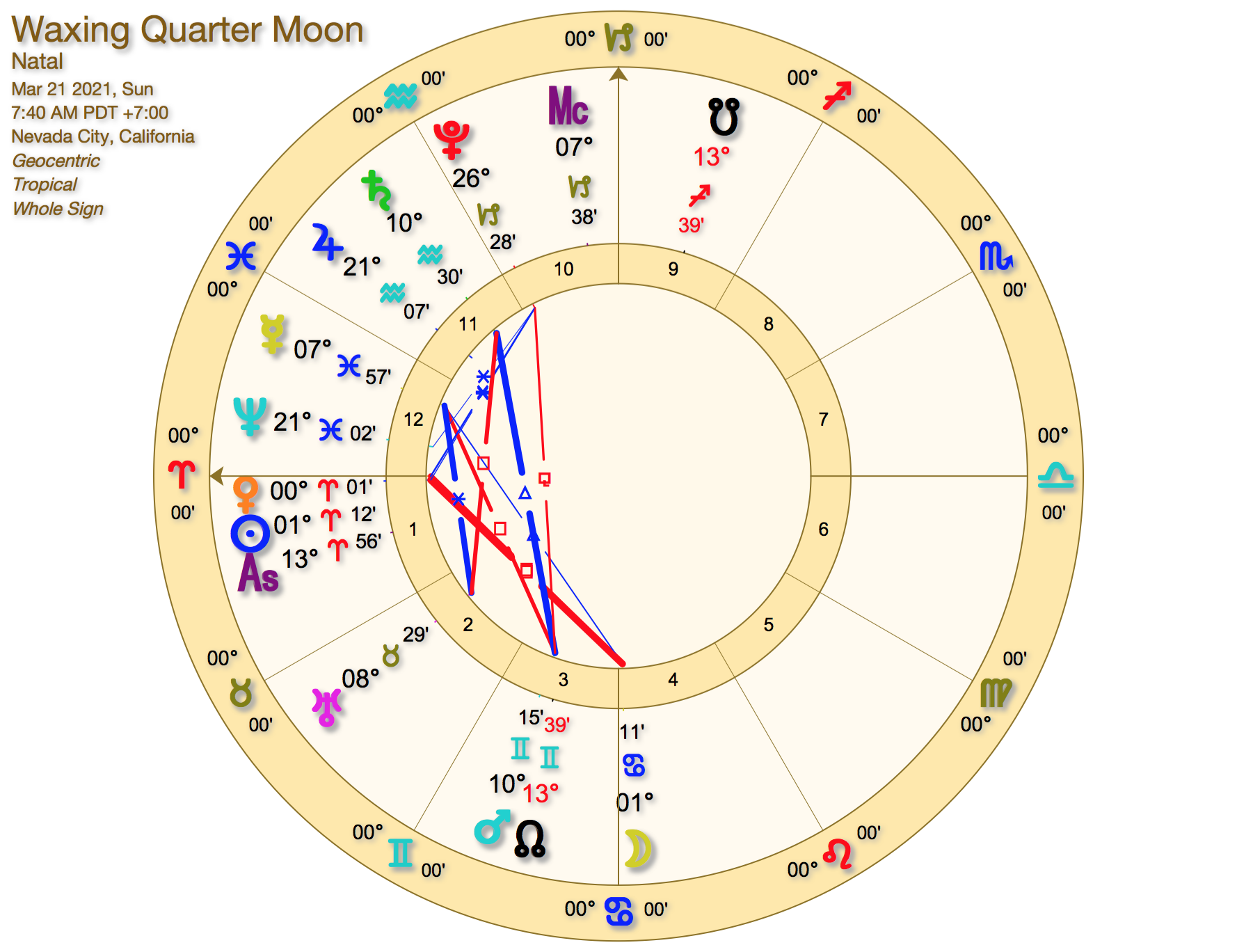 During this lunation cycle the inner planets Mercury, Venus, and Mars form an intertwining dance with the outer planets in quick succession. Neptune is in a soft sextile to the Jupiter-Saturn-Pluto conjunction, and Mercury and Venus form major aspects to the entire set of planets, with Mercury trining the stellium and Venus opposing it, and Mercury opposing Neptune while Venus trines it. Together they form an exquisite and rare mystic rectangle, a complex aspect pattern made up of two oppositions, two trines, and two sextiles. Mars joins the dance, continuing to square Jupiter-Saturn-Pluto, and finally squares his lover Venus on the same day Mercury sextiles her. One can perceive an image of archetypal forces weaving a sophisticated pattern around our Earth, drawing us all into the dance in one form or another.