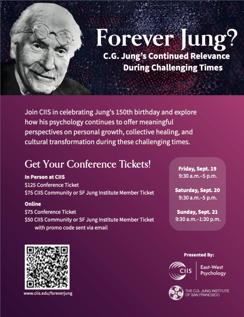 Over the autumn equinox weekend, September 19–21, the East West Psychology Program at the California Institute of Integral Studies will be co-hosting a hybrid online/in-person conference with the San Francisco Jung Institute entitled, Forever Jung? C.G. Jung’s Continued Relevance During Challenging Times.