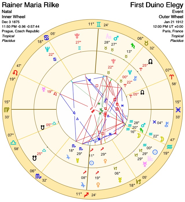 Rilke wrote the Elegies over a ten year period beginning in 1912, but left a long gap between late 1914 and 1922 when he finished the series. For this essay I will focus in particular on the transits to Rilke’s natal chart on the day he wrote The First Elegy, January 21, 1912, and glance briefly at some of the outer planet transits he experienced over the following three years as he wrote the next three Elegies.