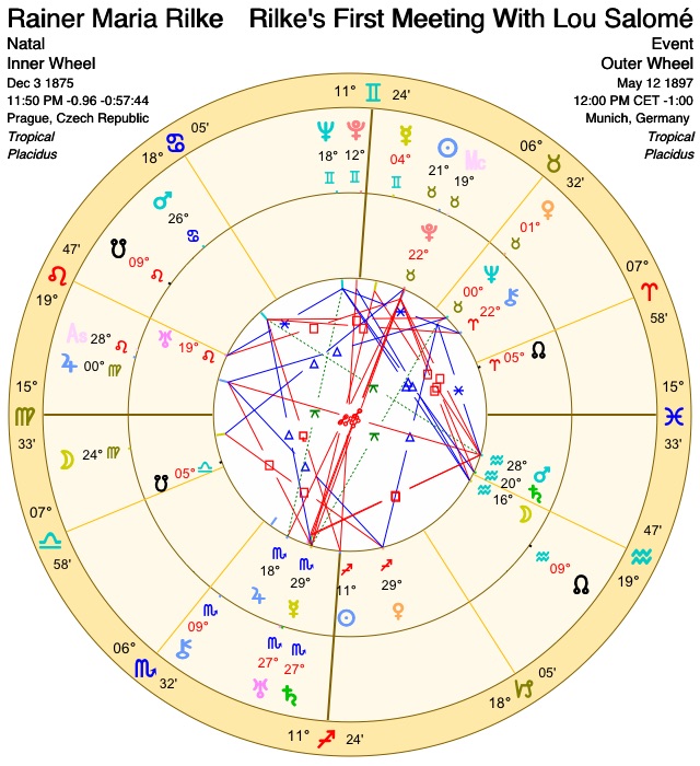 The day that Rilke met Lou Salomé, May 12, 1897, when he was only twenty-two years old, a powerful transformation was set into motion in Rilke’s soul. On that day there was a Venus-Mars square in the sky—the archetypal configuration related to romance in which Mars is the passion and fire that attract the Venusian lovers to one another—that was aligned right on Rilke’s natal Neptune. As his lover, Lou introduced Rilke to new ways of engaging with spirituality and religion as a means to attend to his own soul development, all of which are symbolized by the Neptune archetype.First Meeting with Lou Salome