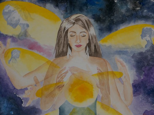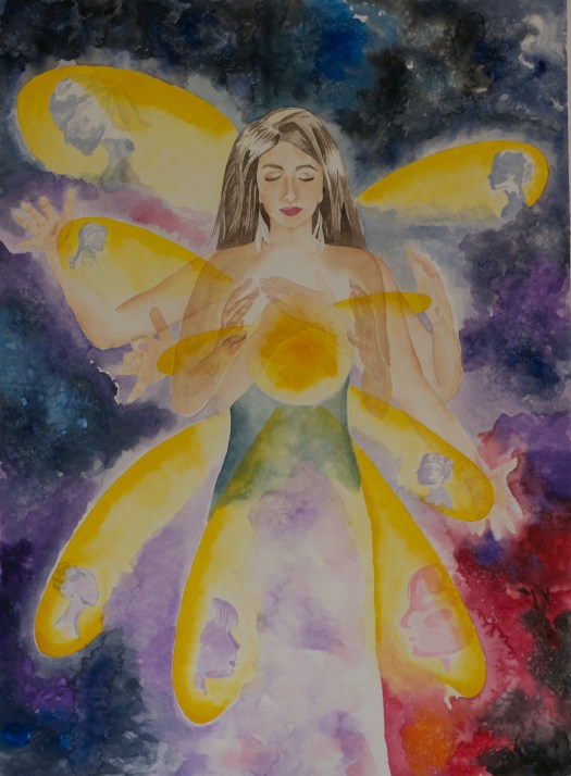 I look deeply into my death’s eyes, seeing the beauty present in this moment, embodied in her. My death. And for her too I am death, the bringer of this life’s closing. We lock eyes. A smile plays across my lips, and a light giggle escapes on my breath. What is this? A sense of utmost relief. A release from the hold of incarnation. We reach up to touch each other’s hands and then, as if this was always meant to happen, we fall into a deep embrace, sinking into the comfort and warmth of each other’s presence.