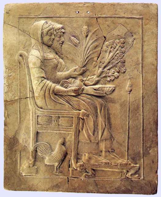 In the myth of the Cabiri, Hades and Dionysos are both associated with the name Axiokersos, the third god in the sequence of Samothrace.[21] Additionally, Persephone’s Cabiri name is Axiokersa, which contains the root “Kersa,” derived from the Hebrew hrs, or Ceres, the Roman name of Demeter.[22] Thus Schelling and other sources conclude that Demeter and Persephone are really one and the same, two parts of a continuous cyclical being.[23] Demeter’s Cabiri name, Axieros, Schelling has translated as “hunger,” “poverty,” “yearning,” “seeking,” and “longing.”[24] She is the first god of the Cabiri sequence, in a continuous state of seeking and drawing all things in toward her.[25] Culturally, Demeter is an older goddess figure than her Olympian brothers, and can in many ways be considered first, the fertile ground of being out of which the harvest grows.[26]
