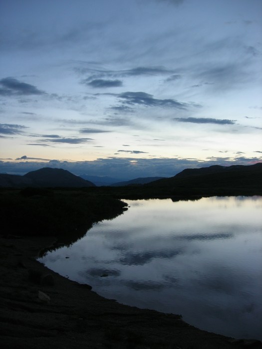 After the plains we passed the town of Buena Vista, and saw several signs protesting a Colorado Springs plan to dam this valley for a reservoir. It was hard to imagine these canyons and valleys sunk below placid waves, a lake that would most likely surrender to silt build-up in less than a century. Our route turned on to 82, and we circled a still, blue lake, reflecting the high peaks in exact mirror image. The road climbed ever higher, making sharp turns on the mountain’s face, leaving the bottoms of my feet with that hollow tickle that accompanies a slight fear of heights. The evening sun rises and sets constantly in the mountains as new views open beyond each passing peak. Yet at last it set for good, and our road became ever dimmer.