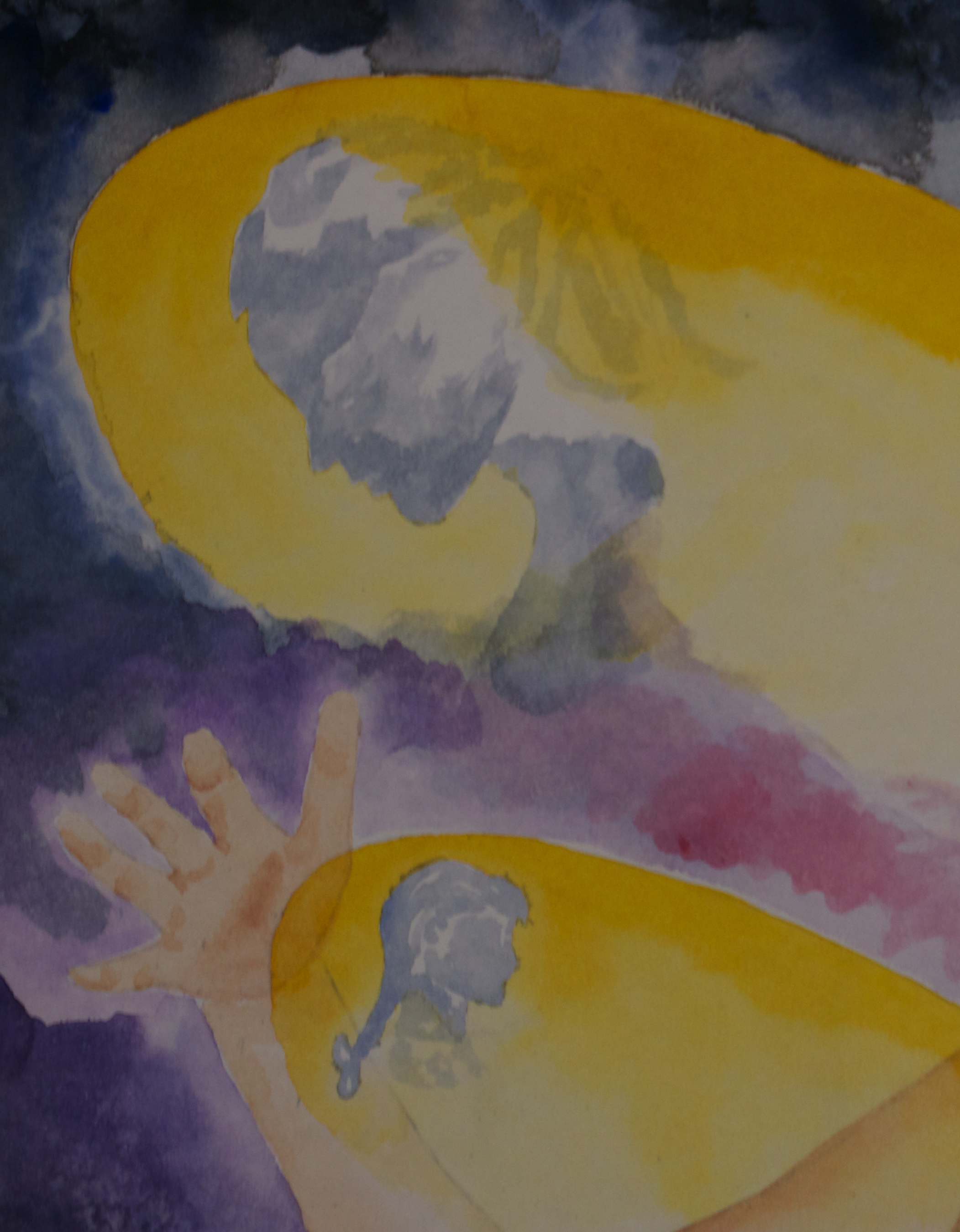 I found in my attempts to paint this nebula with watercolor that portraying the light and darkness, the veiled colors of the celestial event, was much more difficult than I had previously expected and took more than one try. When one looks at a photograph of a nebula it is the qualities of the whole that are so compelling, but in painting it I had the experience of becoming intimately familiar with each part, trying to understand where the colors blend and where they do not, yet also attempting to capture the whole as well. The only adjustment I made from the image as I painted it was emphasizing the diamond at the heart, forged in the layers upon layers of light and color.