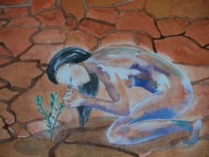 This painting of a drought-ridden desert with a single sapling growing in it is less an image of the Diamond Soul, but rather of the birth canal humanity seems to be entering before such soul transformation is possible. The painting is a representation of the changes rapidly being wrought upon the globe by human-induced climate change, and was particularly inspired by Bill McKibben’s book Eaarth: Making a Life on a Tough New Planet. McKibben provides the data that clearly demonstrates that global warming is no longer a future threat, it is a current reality. On a personal level this understanding was reinforced by a road trip I took across the American Continent this July while creating the concepts for this gallery. From Nevada to Michigan temperatures soared above 100° F, usually averaging at 104° but sometimes even reaching 108°. Fields were dry and often barren, and many cornfields showed yellowing leaves coated in a layer of dust. Yet oil wells continued to pump in these same fields by the roadside, and every building we entered was blasting arctic temperatures of air conditioning, all fueled by coal and oil burning power plants.