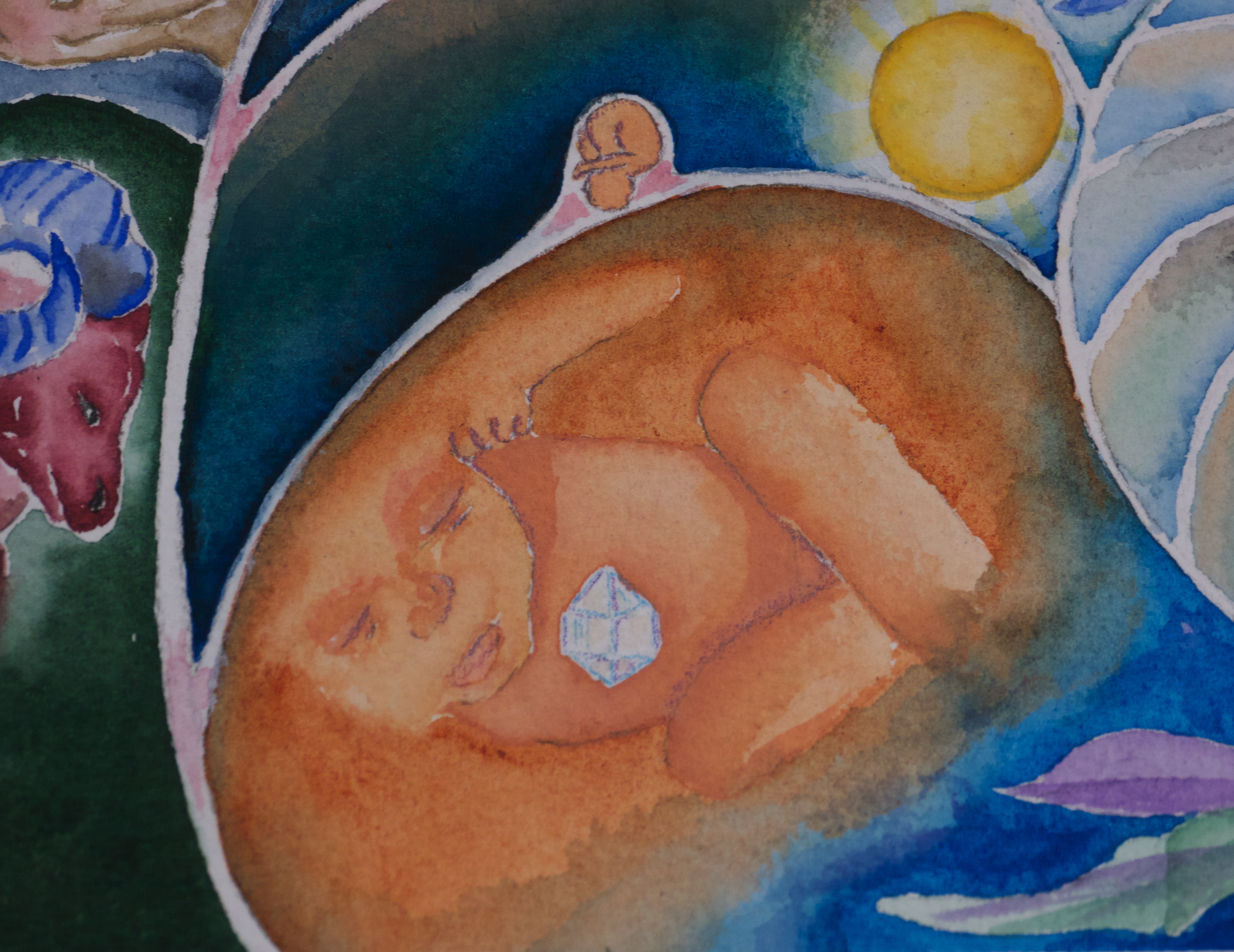 The Oversoul is a term used by Bache in his book Lifecycles to describe the larger soul overseeing, but also incorporating, each incarnating human life. It is simultaneously a single entity, but also a family of entities nested within each other, and ultimately nested within the larger and larger spheres of existence. This painting is one representation of the Oversoul, pictured as a nautilus, an image Bache provided in class. The chambers of the nautilus each represent a human incarnation, yet the whole shell is the full soul. I have depicted a waiting fetus gestating within each chamber as a symbol of these lives. The life about to be born resides in the outermost chamber, with a diamond in potentia within his heart. The diamond represents the Diamond Soul being forged slowly over the course of each lifetime. A second diamond resides in the center of the nautilus representing the ultimate birth of the Diamond Soul at the end of the incarnational process.