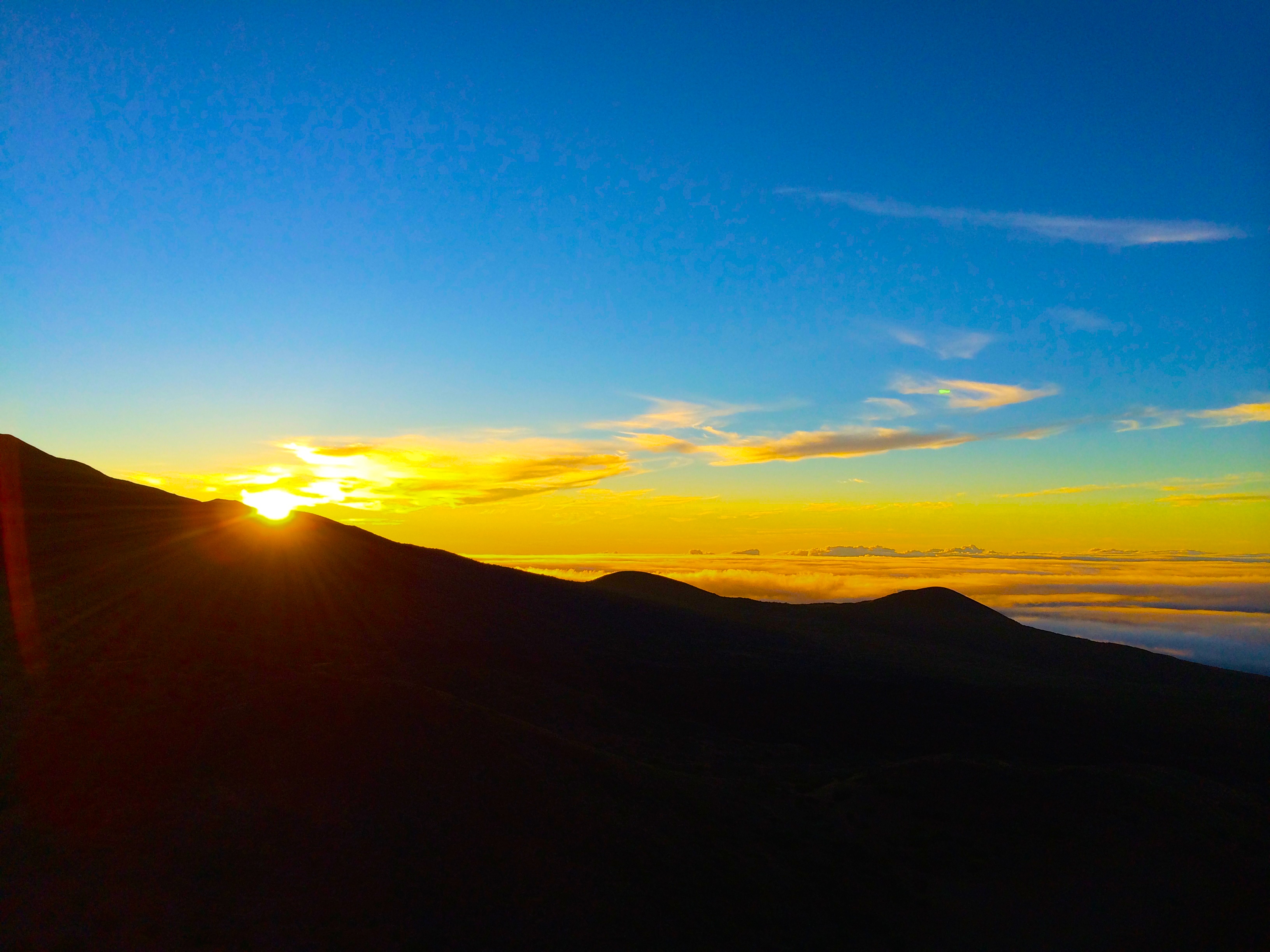 Because we just missed the sunset I had the thought we could sleep in our van right at the visitor’s center, and wake up in time to see the sunrise. So we spent the night at 9,000 feet, our first evening where the temperature was actually cool, awaiting the dawn. I’ve had an interesting experience with my dreams since coming to Hawai’i: each night we stayed in Waimea my dreams were incredibly violent in content, but when we slept on Mauna Kea my dreams changed completely. There was a majestic stillness; I dreamt mountain-consciousness and starlight. The experience was far beyond human. It was grandness, height, vastness. Stillness. Without an alarm I awoke as the sky was getting light, and woke Matt up so we could climb back up the nearby hill to see the Sun complete its night journey as it passed back above the horizon. The sky lightened slowly, reds and salmon-orange clouds streaking the yellowing sky. Behind us the shadow of Mauna Kea stretched over the plane below. The wind picked up in the moment before the Sun seemed to melt as fiery gold over the horizon. Awe. No wonder we are drawn to worship this life-giving orb of fire. The landscape all around awakened, golden light hitting the edges of the pu’us, the cinder cones, down the slopes of the mountain. At long last we left, having seen the Sun at last from the heights of Mauna Kea.